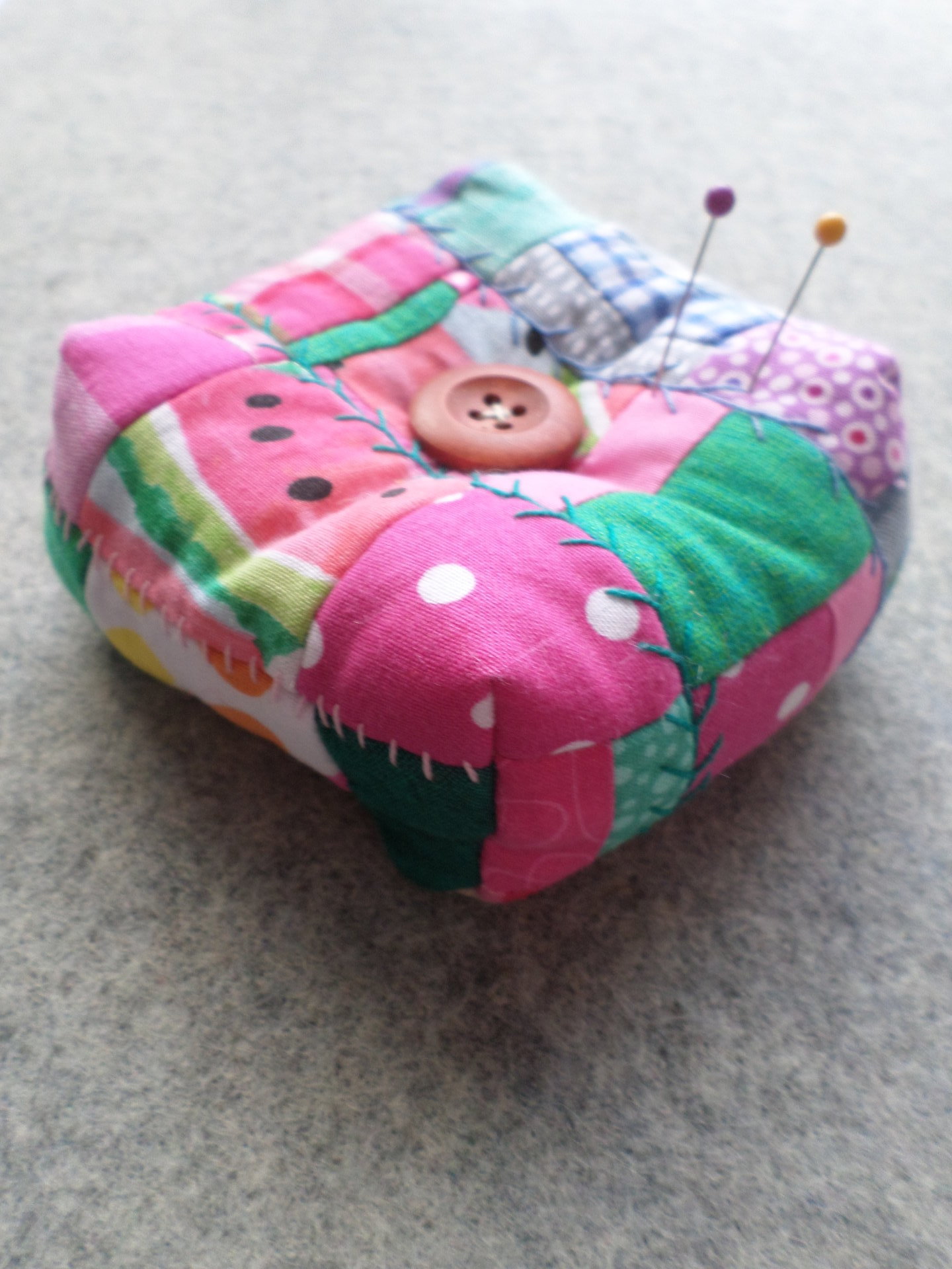 Crazy Quilt Patchwork Pincushion, Hand Embroidered in Pink and Green Cottons