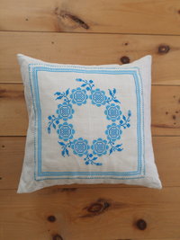 New linen sham appliqued with a vintage hand-embroidered Scandinavian cross-stitch piece.